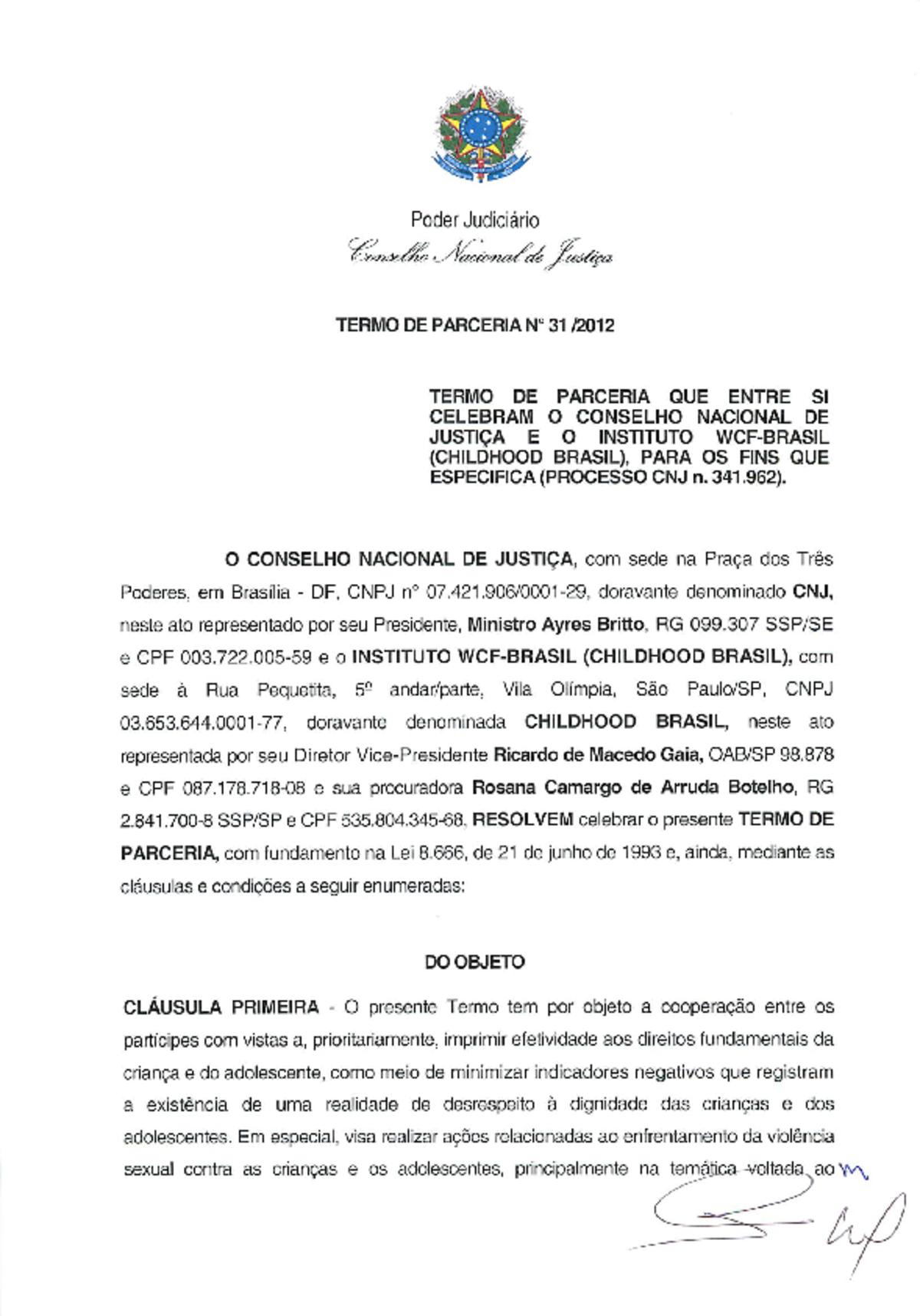 Termo de Parceria nº 031/2012, assinado entre Childhood Brasil e Conselho Nacional de Justiça (CNJ)